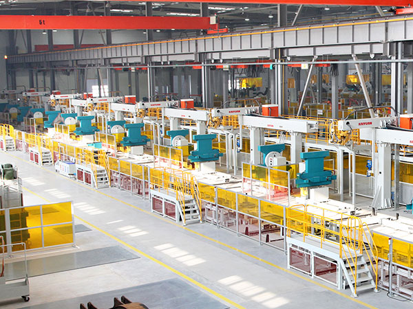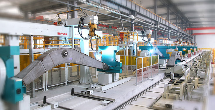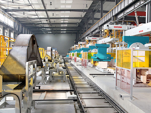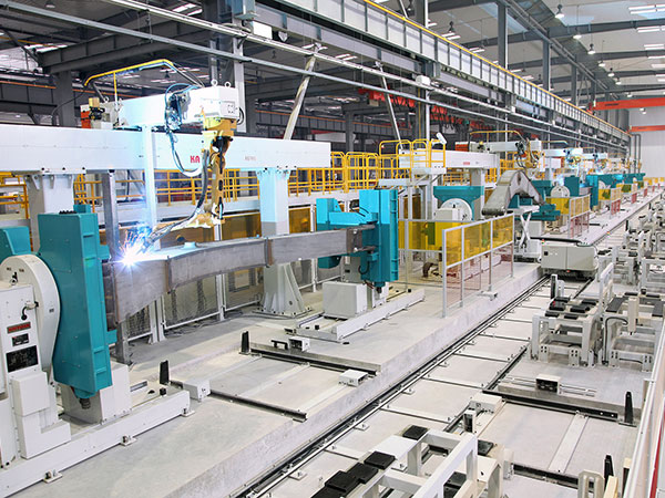 中厚板智能化柔性焊接生產(chǎn)線(FMS)由機器人智能焊接系統(tǒng)、物料自動搬運系統(tǒng)、焊接制造管理信息系統(tǒng)、生產(chǎn)線智能控制系統(tǒng)集成,實現(xiàn)機器人均衡化自動混流生產(chǎn)。